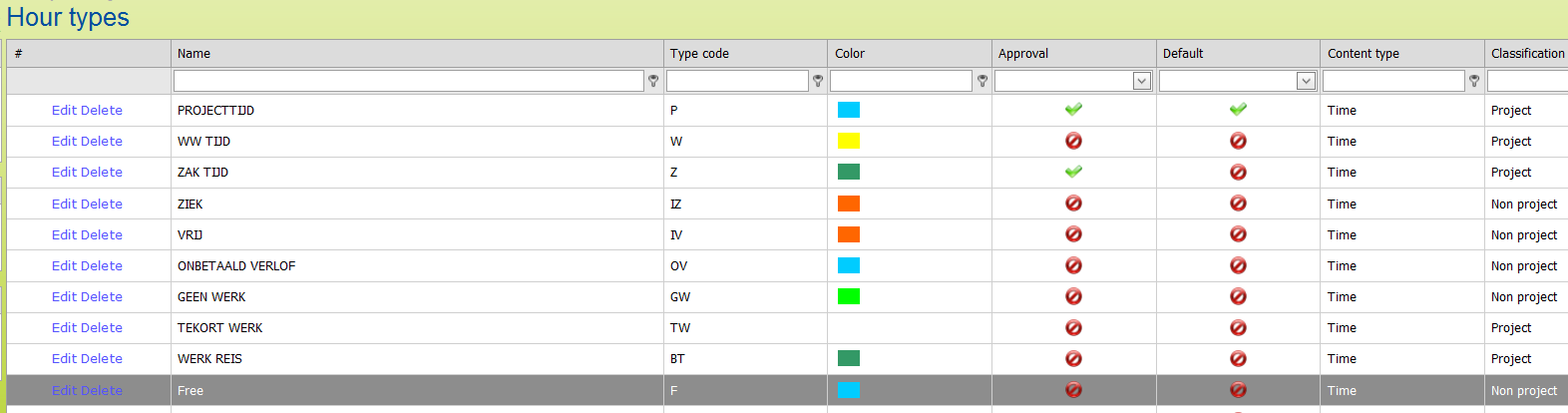 If you would like to automatically calculate working and/or perform subsequent costing on projects/assignments, all registrations must be linked to an hour type. Only then is it known how a certain time registration should be paid out. All possible time registration therefore need an hour type. An hour type among other things determines whether the time should be related to a project/assignment or not.