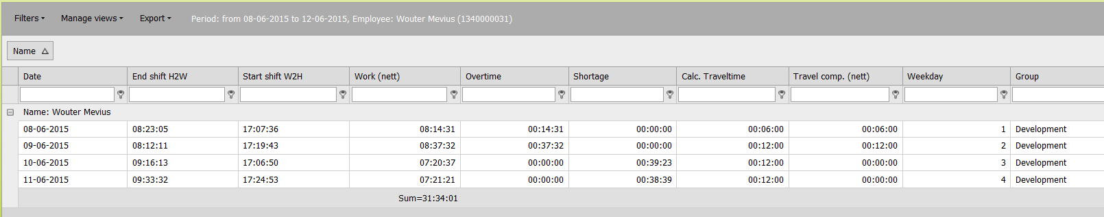 Gross working time | The working time calculated by the shift calculation, in hh:mm or decimals |
