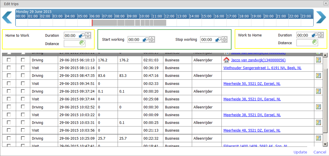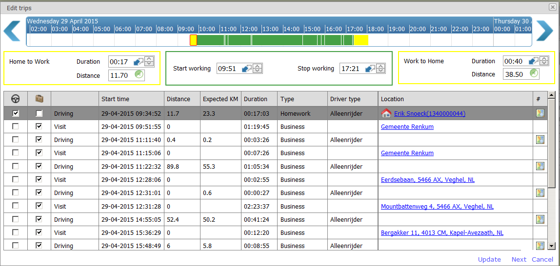 After activating the trips and visits, the total screen is filled automatically with the travel time and distance of the outward and the travel time and distance of the return journey. The start and end working times are also calculated.