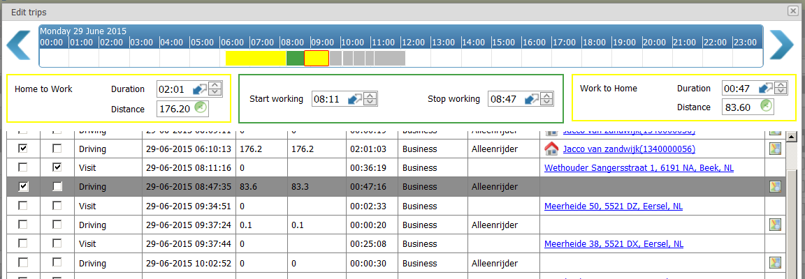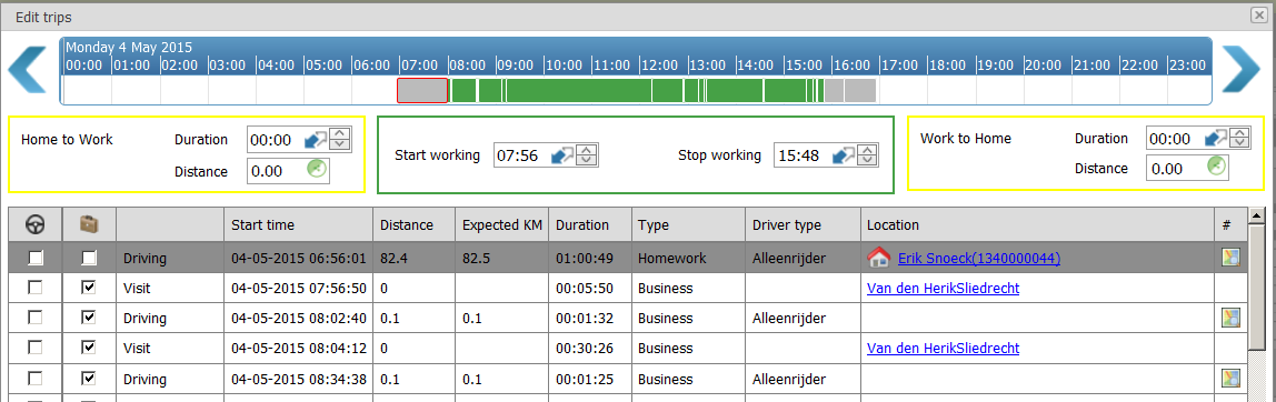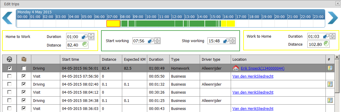 Details | The details display all registration as you know them from the FieldLog reporting; both the trips and the visits are displayed. If the employee starts from the home address in the morning and later that day ends at the home address you will see that displayed with a little house. At the start you see two columns that are important and are sometimes ticked and sometimes they are not.