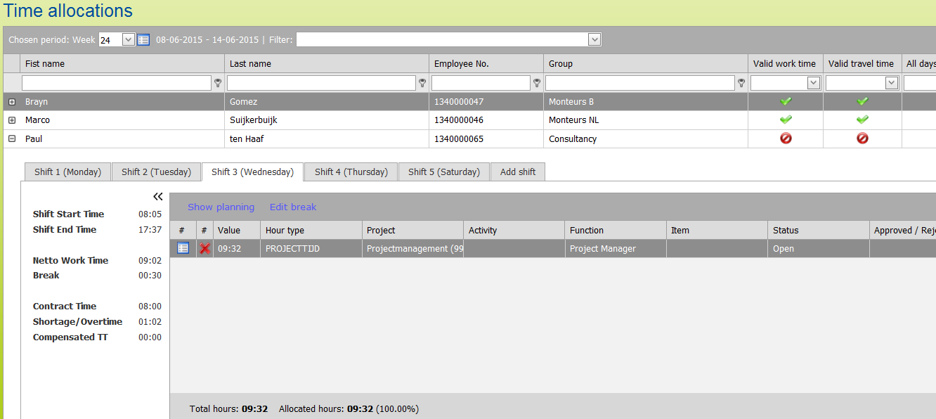 This will display the calculated shift on each tab. On the left hand side totals of the shift and on the right the details with the breakdown of the gross working hours to time registrations.