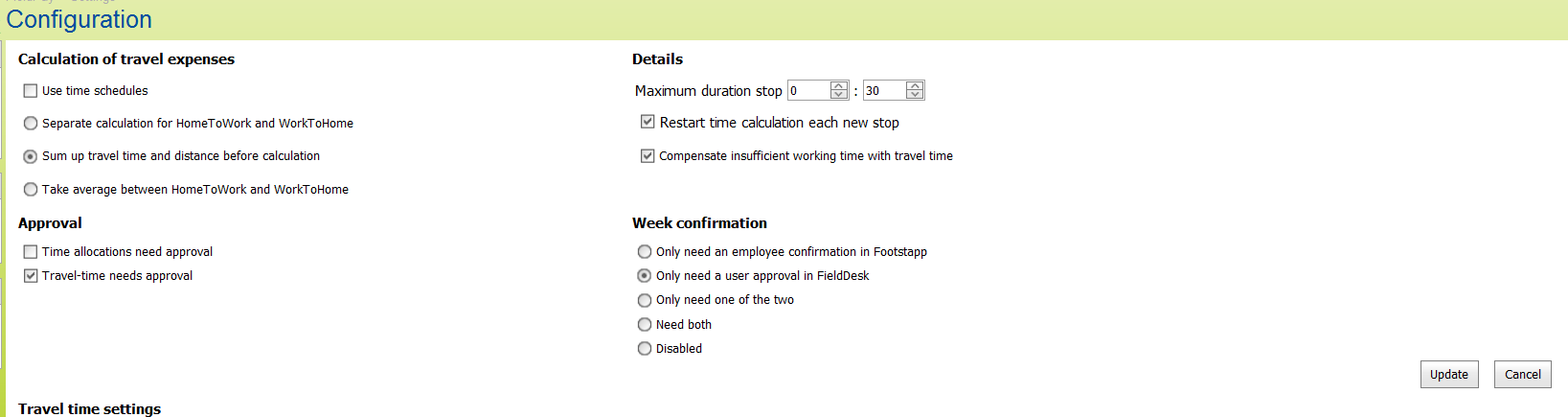 Approval | These settings apply if you make use of Fleet Complete’s Projecttime app (Android or iOS). You can let the executor approve the hours entered by the employee. Here you determine whether the executor should do this and if so, for what hours: the hours within working time (time registrations) and/or the commuting travel time. If both settings are deactivated, you opt for the executor not to approve any hours. |