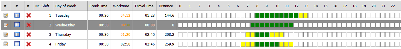0-24 | The graphic display shows boxes of an hour. The coloured boxes give a quick insight in the course of the service. Green indicates calculated service time. Yellow indicates travel time during service time eligible for compensation. |